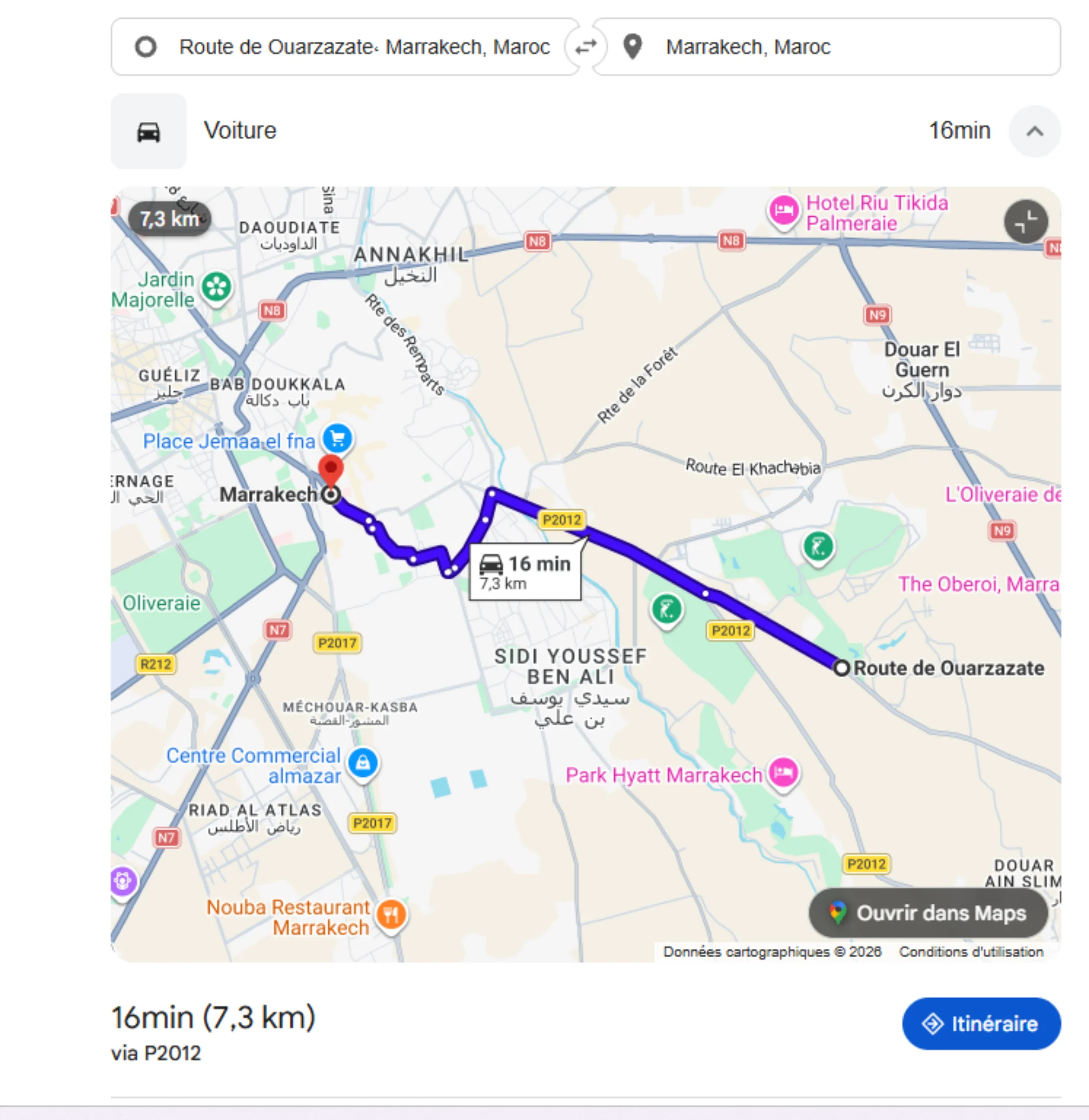 La Route de Ouarzazate bénéficie d’une excellente accessibilité. Selon l’emplacement exact de la propriété, elle se situe généralement entre 15 et 25 minutes du centre-ville de Marrakech et de l’aéroport international. Cette proximité permet de profiter d’un environnement calme et naturel, tout en restant proche des commodités urbaines.